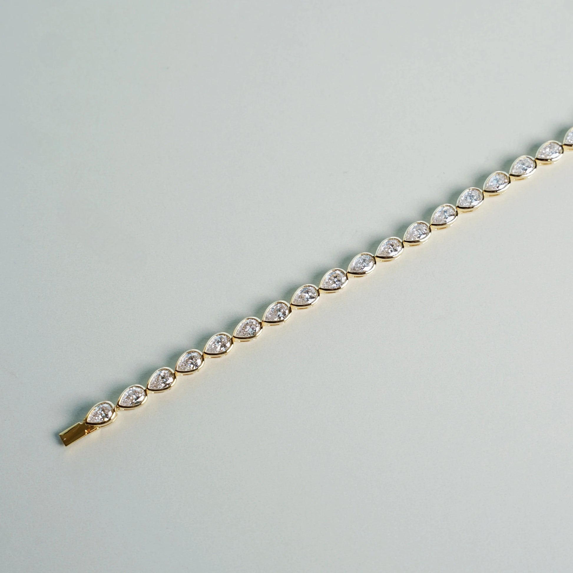 A distinctive tennis bracelet featuring lab-grown pear cut diamonds in bezel settings on 18k gold. A fluid design that sparkles with individuality and timeless grace.
