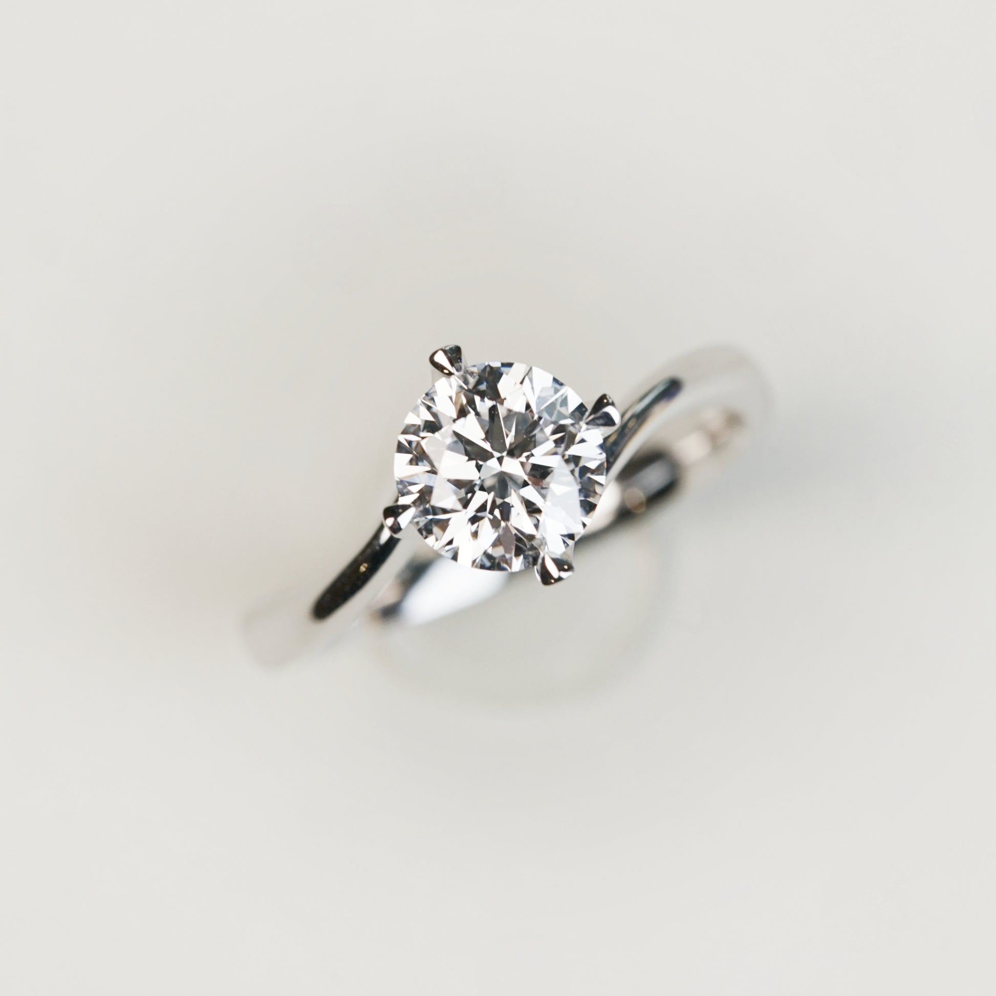 A refined solitaire ring featuring a classic four-prong setting and a delicately twisted band. The subtle twist adds a touch of design while enhancing the appearance of a longer, more slender finger.
