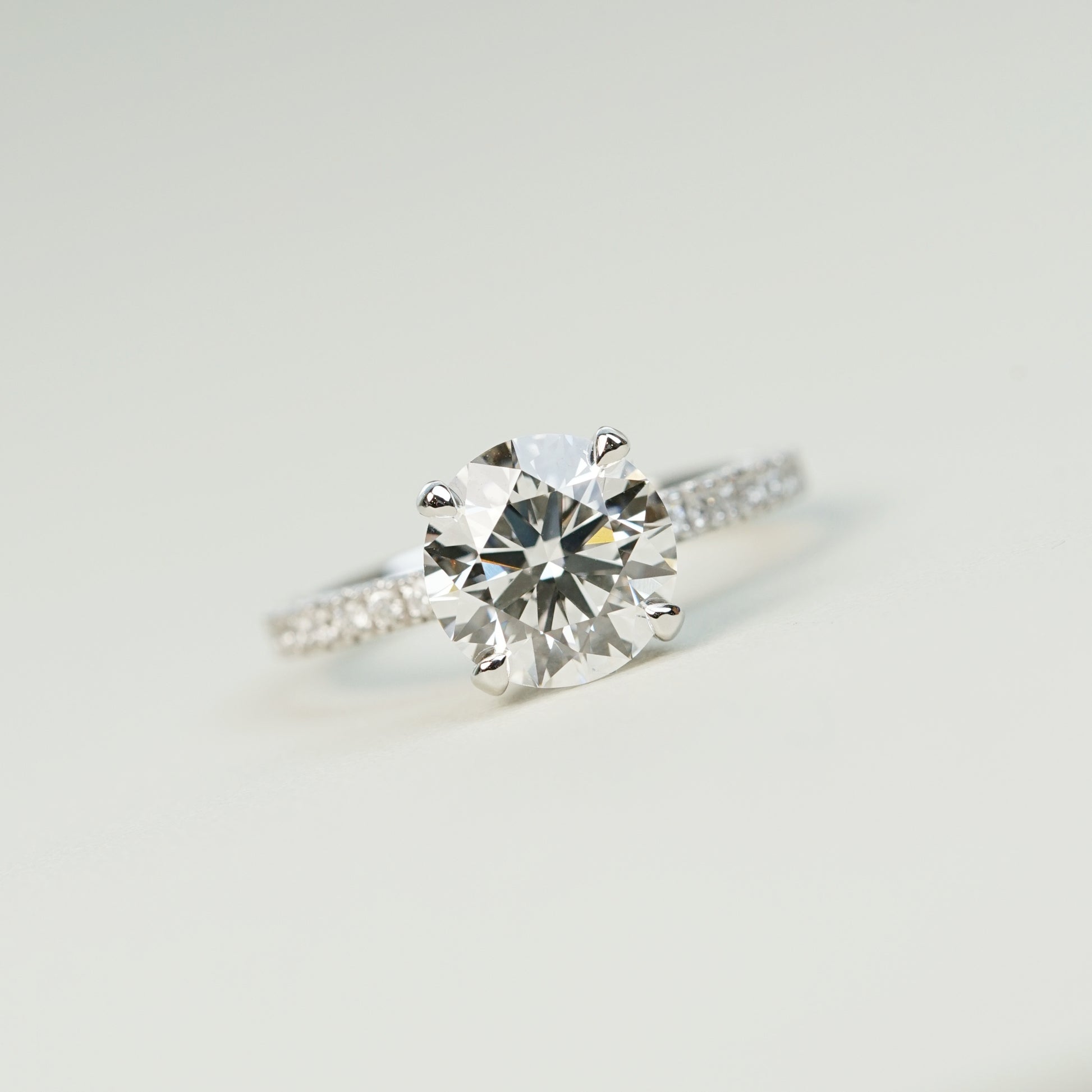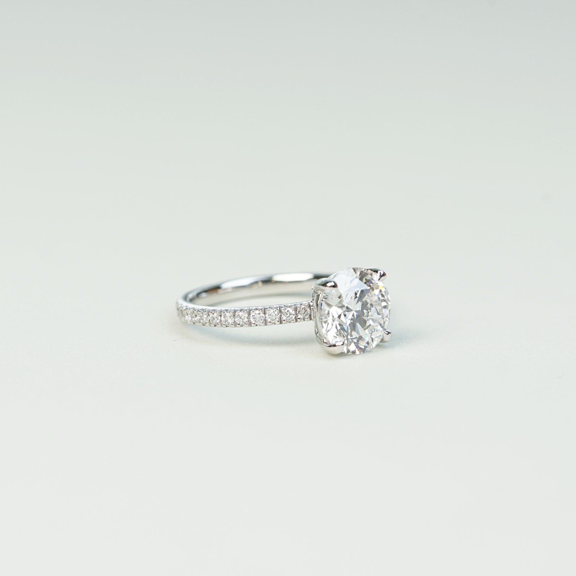 筆直的密釘鑲鑽戒圈設計,碎鑽沿戒臂整齊排列,線條俐落純粹,營造連貫而細緻的光芒效果,自然襯托主鑽成為視覺焦點。