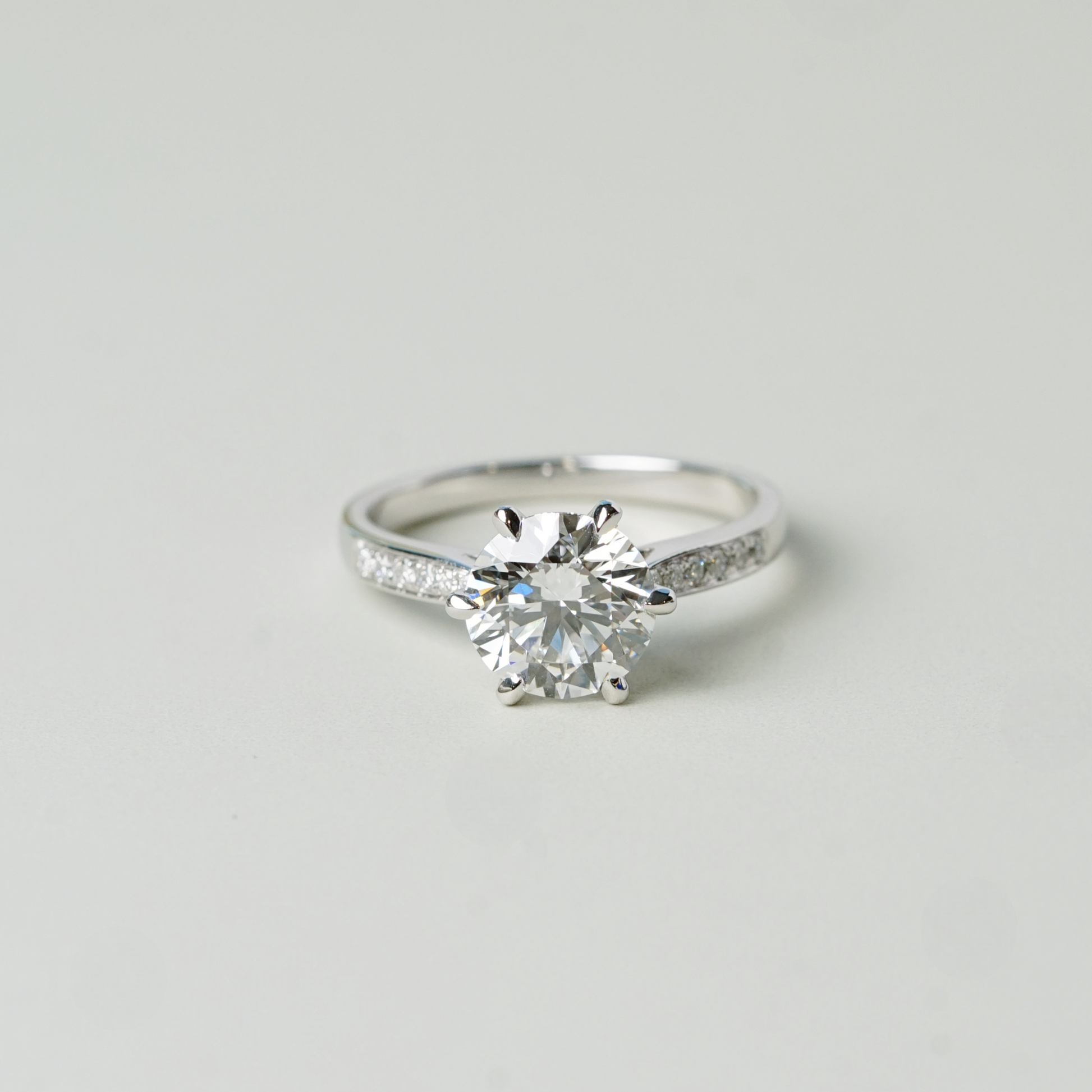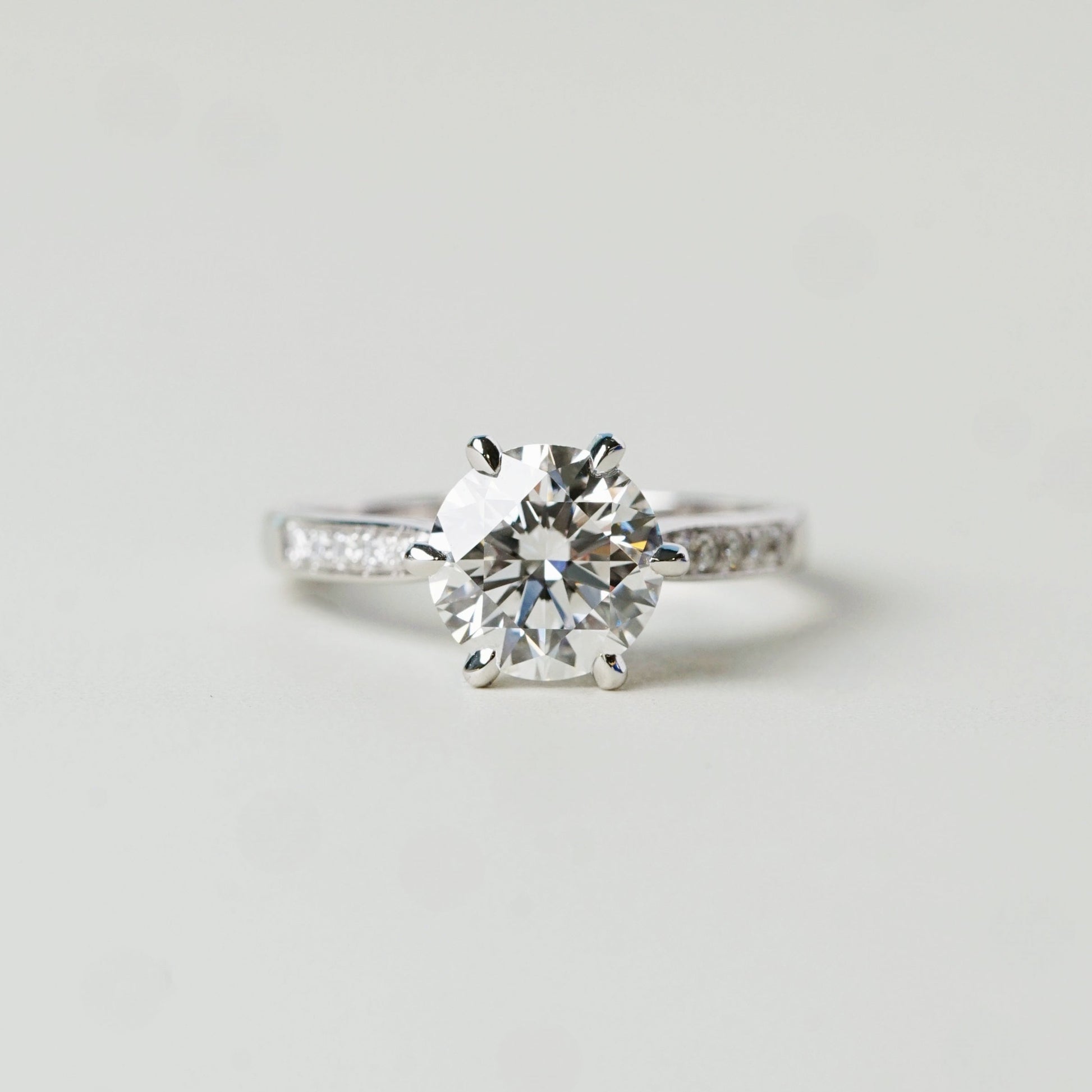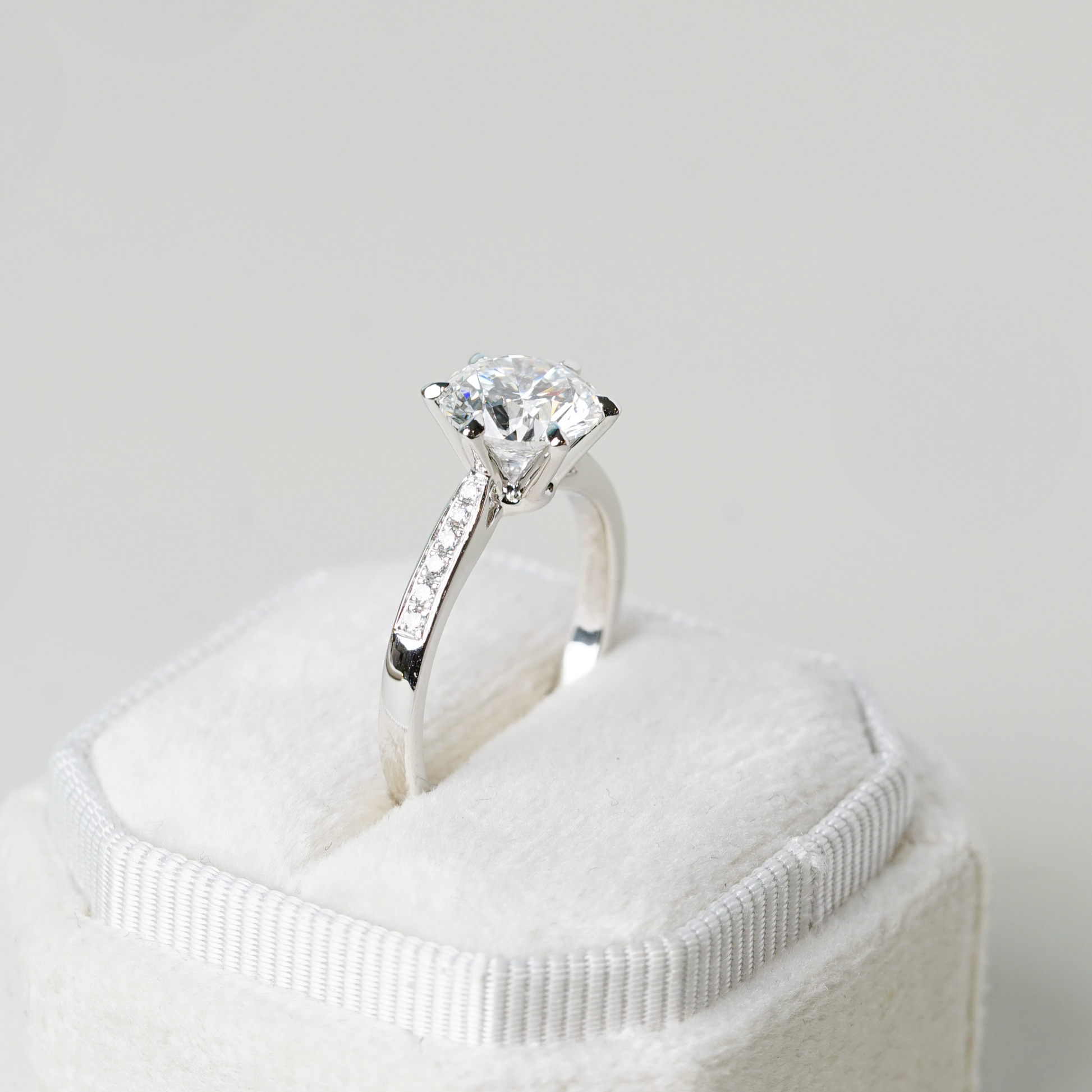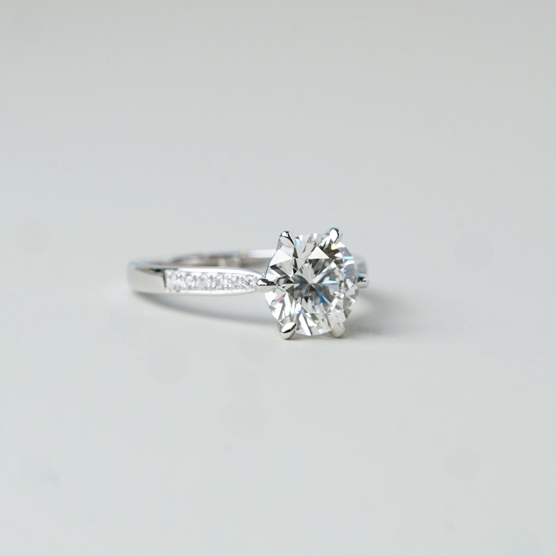 戒托以漸收式鋪鑽戒圈為設計特色,戒圈鑲嵌代表永恆的細緻培育排鑽,於不搶主石焦點下延伸光澤,整體比例細膩而平衡。