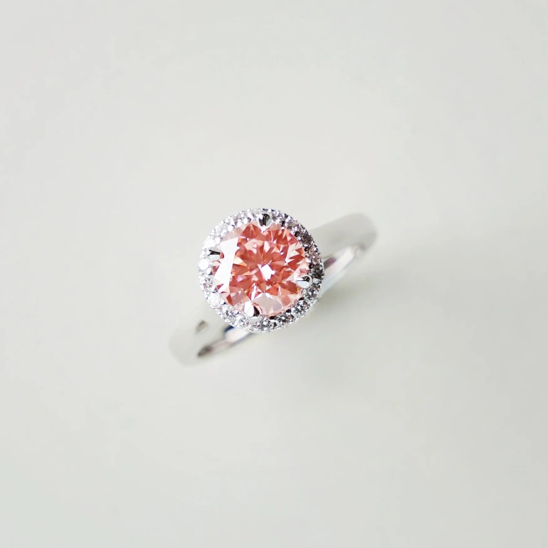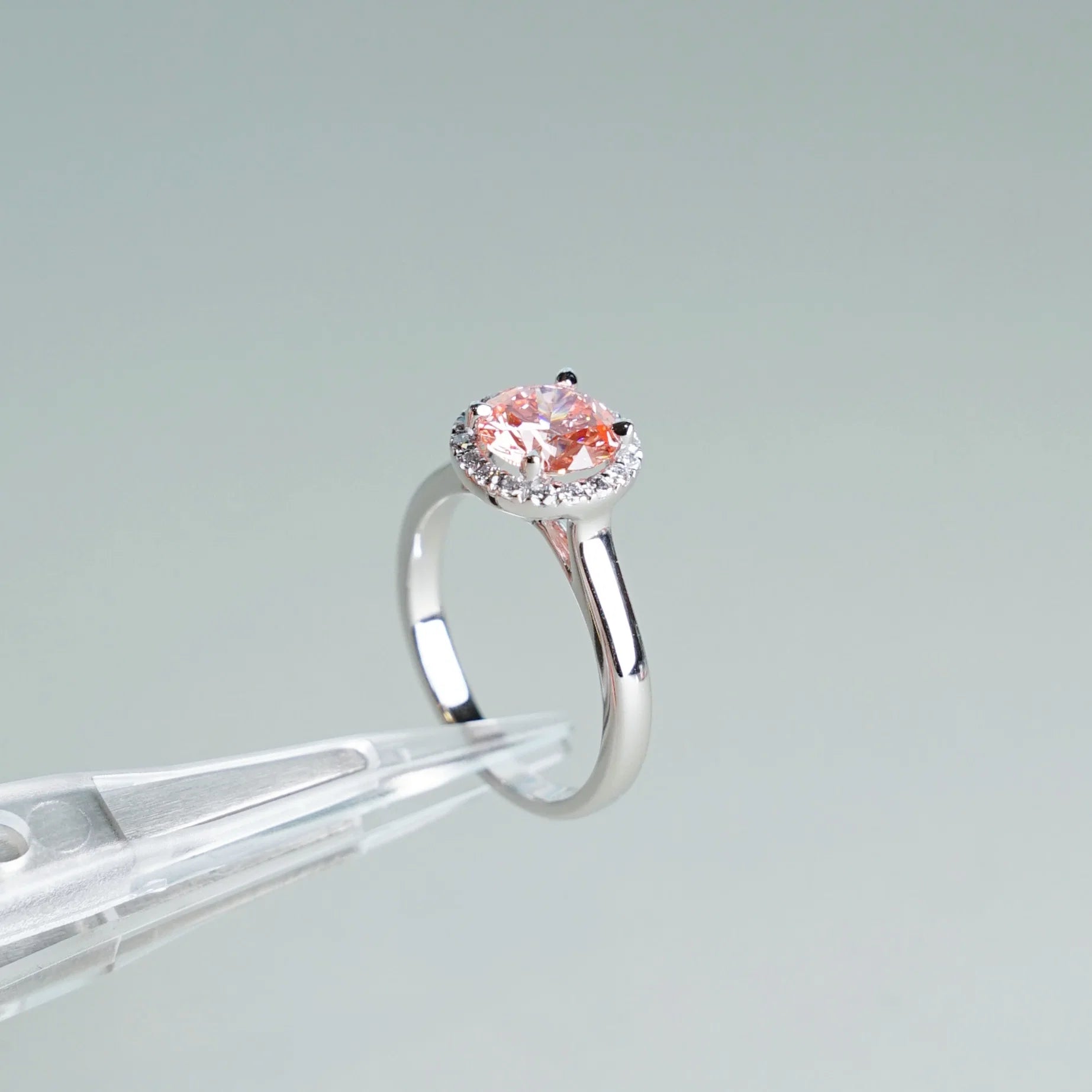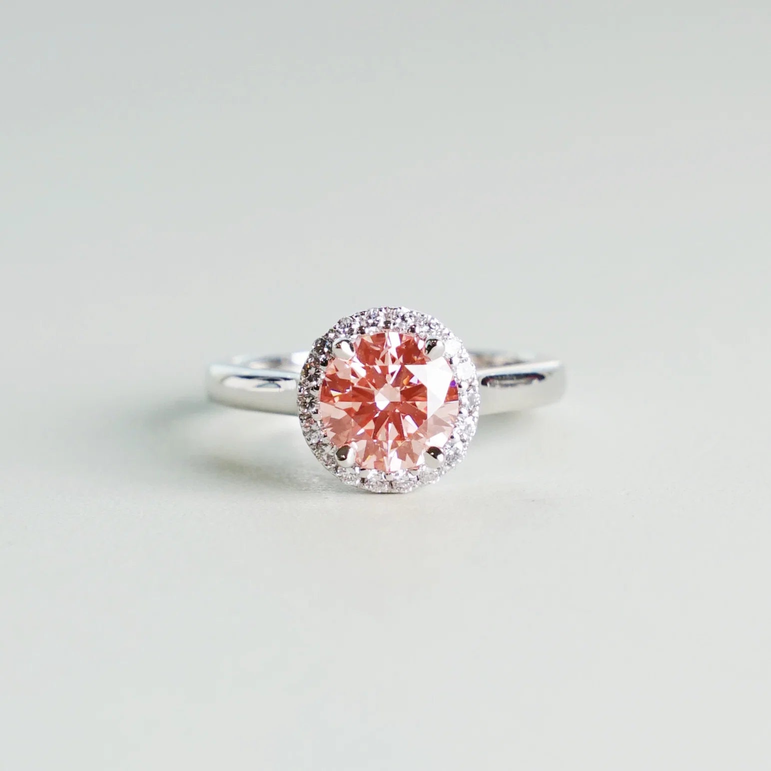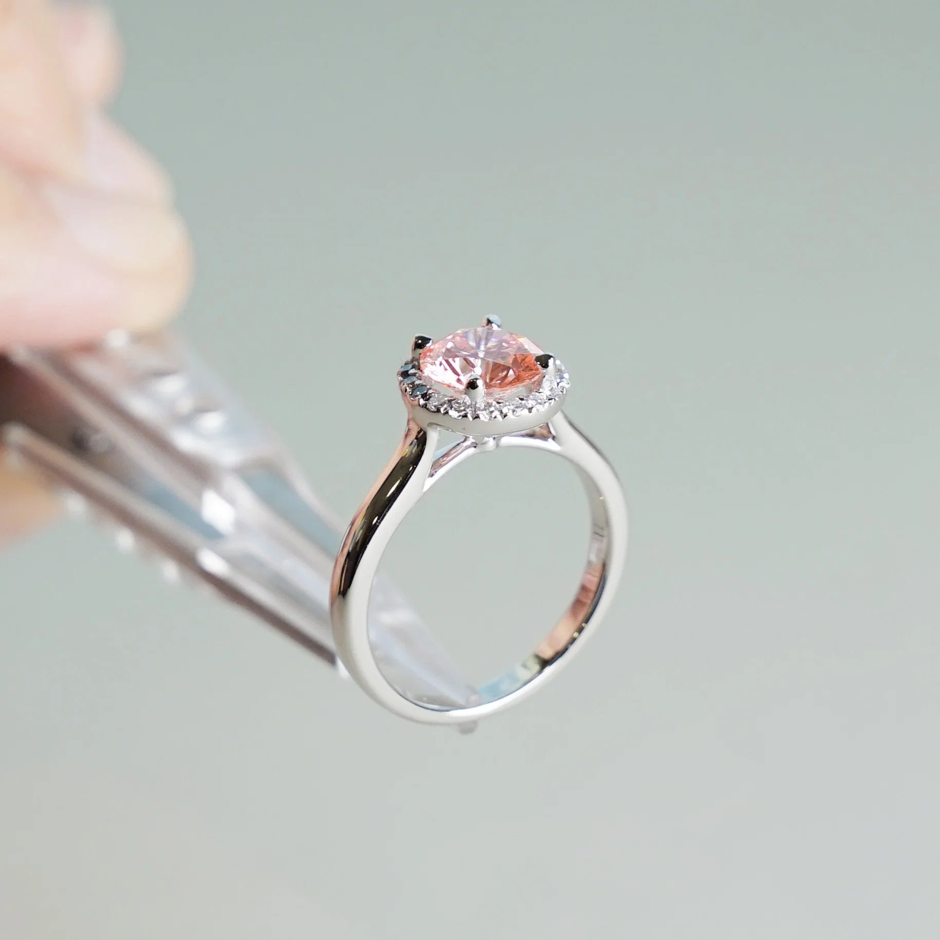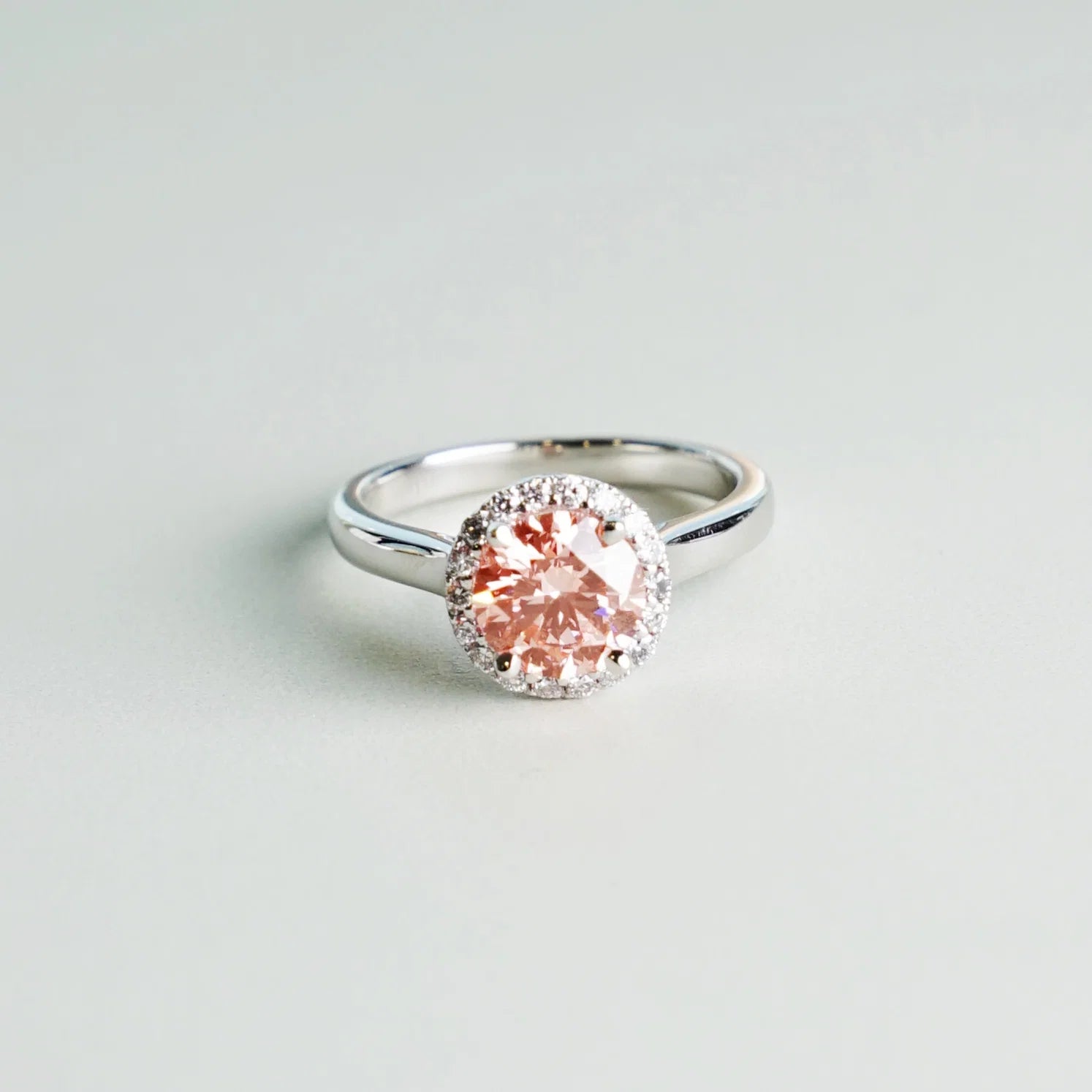 此款戒托以光環鑲座環繞主鑽,層層細鑽有效提升主石亮度與視覺份量感。搭配直身戒圈結構,整體線條俐落平衡,經典而耐看。