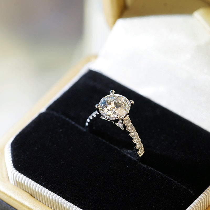 筆直的密釘鑲鑽戒圈設計,碎鑽沿戒臂整齊排列,線條俐落純粹,營造連貫而細緻的光芒效果,自然襯托主鑽成為視覺焦點。